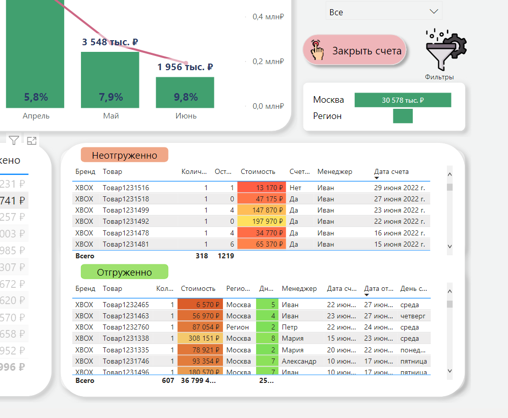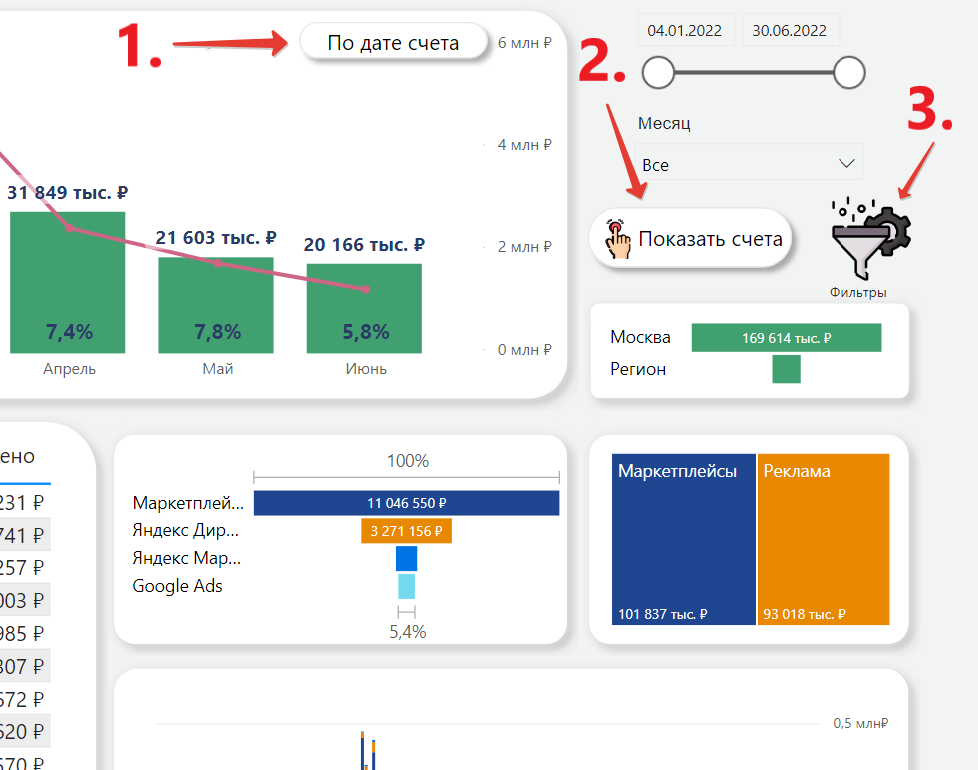 • Фильтруйте данные как угодно, например, по менеджерам, дням создания счета, рекламным каналам и т. д.
