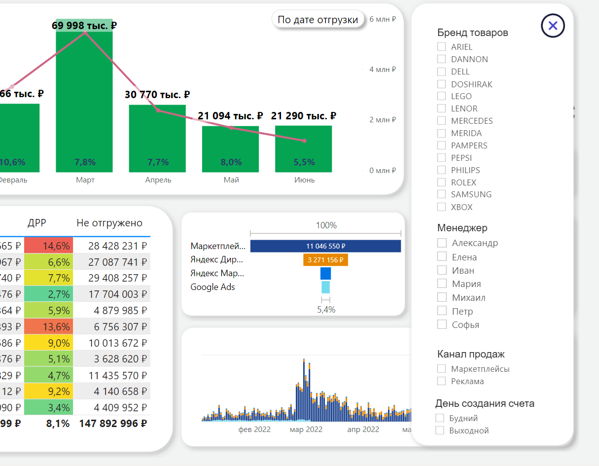 Отчет создан для контроля продаж и затрат в интернет-магазине. Продажи из 1С-Битрикс объединяются с расходами по брендам, регионам и рекламным направлениям. В данном отчете не используются промежуточная база данных, вся информация подгружается и обрабатывается напрямую в Power BI на стороне клиента, только с помощью встроенных инструментов и python скриптов.